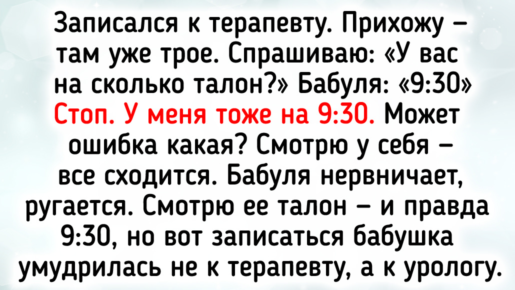 Записался к терапевту. Прихожу — там уже трое. Спрашиваю: «У вас на сколько талон?» Бабуля: «9:30» Стоп. У меня тоже на 9:30. Может ошибка какая? Смотрю у себя — все сходится. Бабуля нервничает, ругается. Смотрю ее талон — и правда 9:30, но вот записаться бабушка умудрилась не к терапевту, а к урологу. © Unknown author / Pikabu