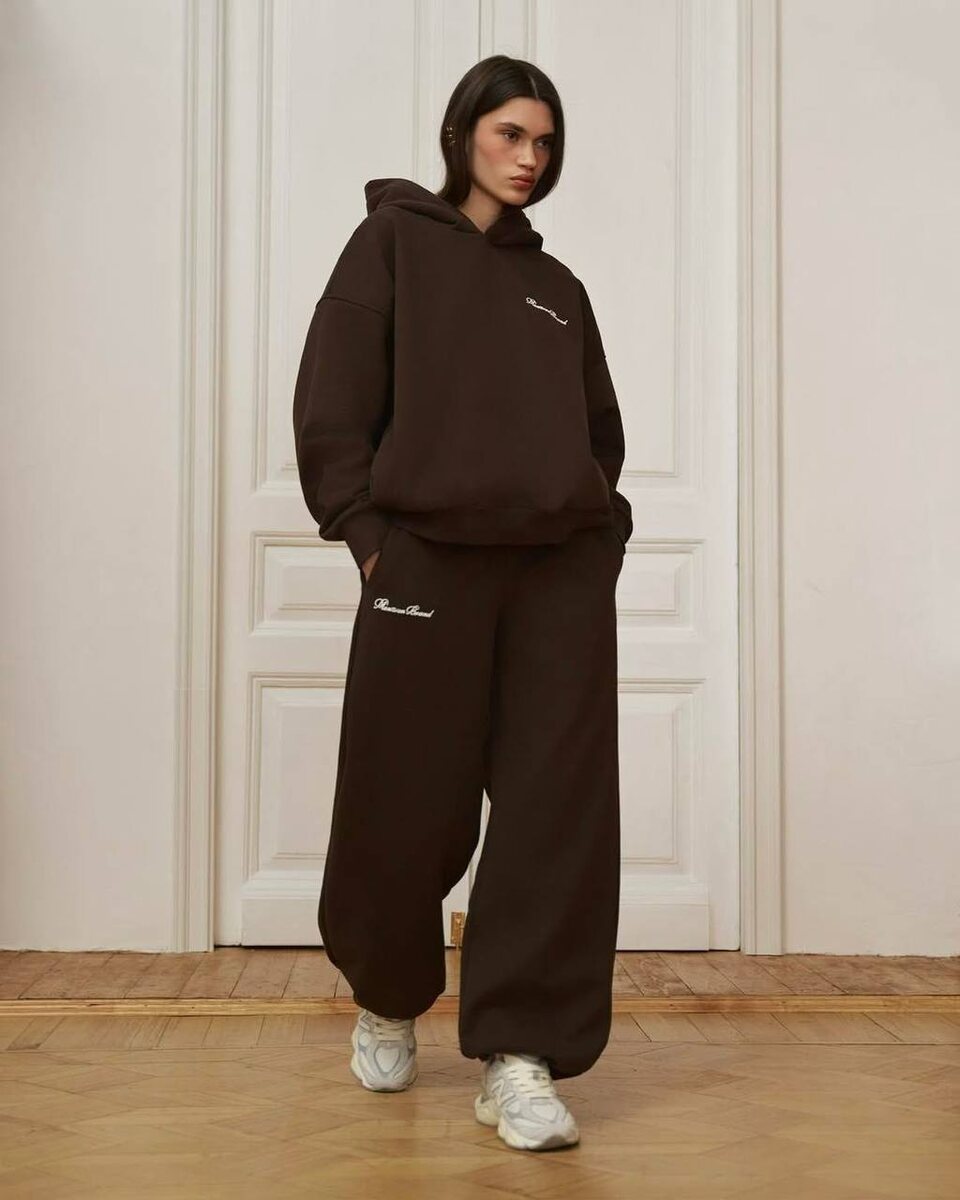 The same but better новый костюм cotton set quiet wealth в шоколадном оттенке из инновационного полотна с начесом, разработано специально для Maneken brand и не имеет аналогов на рынке худи умеренного объема со спущенным плечом — для расслабленного и свободного образа минималистичные карманы в смещённом боковом шве добавляют практичности без лишних деталей