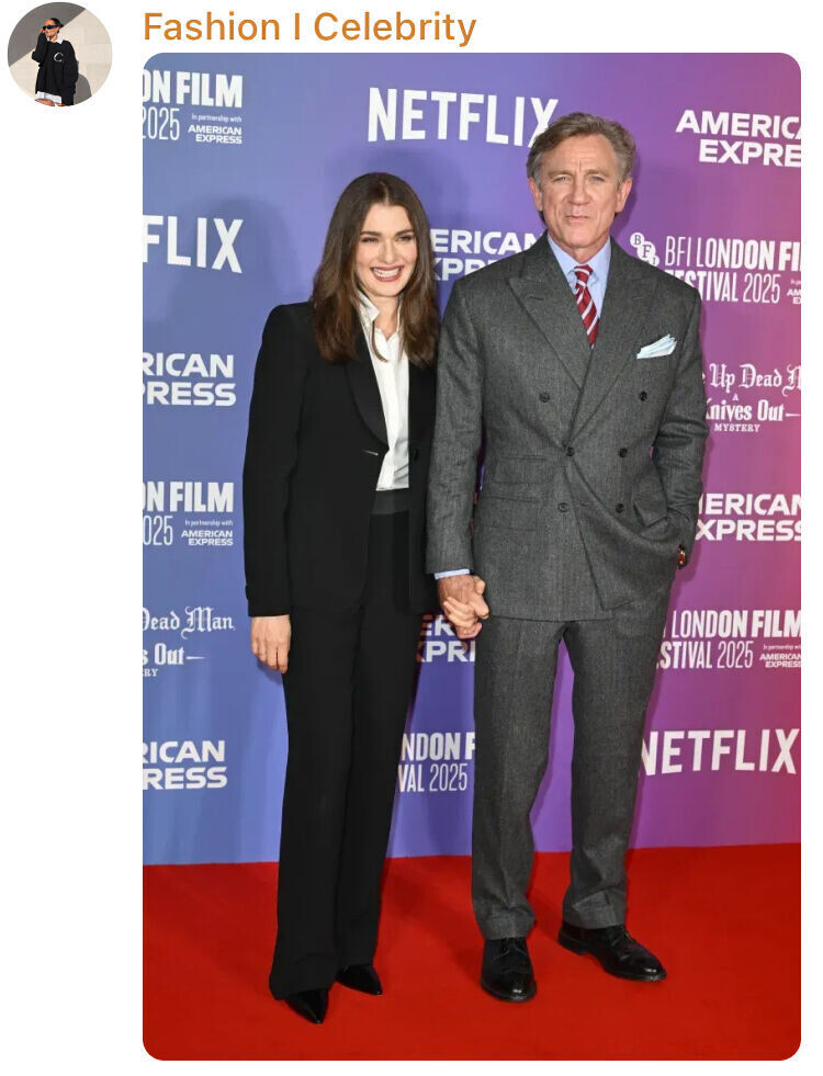 Дэниел Крейг и Рэйчел Вайс не из тех звездных пар, что часто балуют поклонников светскими выходами. Однако премьера третьей части «Достать ножи: Проснись, мертвец» — особый случай. Премьерный показ фильма состоялся в столице Британии, в рамках 69-го Лондонского кинофестиваля. Новое расследование сыщика Бенуа Блана ждали во всем мире, и вот, наконец, Дэниел Крейг представил третью часть детективной ленты. Исполнитель главной роли вышел на красную дорожку с женой Рэйчел Вайс. Супруги в очередной раз подтвердили звание одной из самых красивых и гармоничных пар в актерском цеху. Оба выбрали строгий классический стиль: лаконичные брючные костюмы сдержанных оттенков. На премьере «Достать ножи 3» также отметились также Мила Кунис, Эндрю Скотт, Гленн Клоуз, Грета Гервиг. Детектив «Достать ножи: Проснись мертвец» снял режиссер Райан Джонсон. Это третья часть популярной франшизы (первые два фильма — «Достать ножи» и «Достать ножи: Стеклянная луковица»). Дэниел Крейг вернулся к роли экстравагант