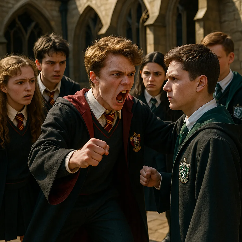 Мики вцепился в четверокурсника со Слизерина. Их окружили однокашники, которые громко кричали. Я еле протолкнулся через небольшую толпу, как раз когда кулак проехался по челюсти Мики. Тот, отскочив, прижал руки ко рту, но в глазах его по-прежнему горела ярость. Сплюнув кровь, он с криком кинулся в новую атаку. Я выскочил вперед и перехватил его, крепко прижав к себе.