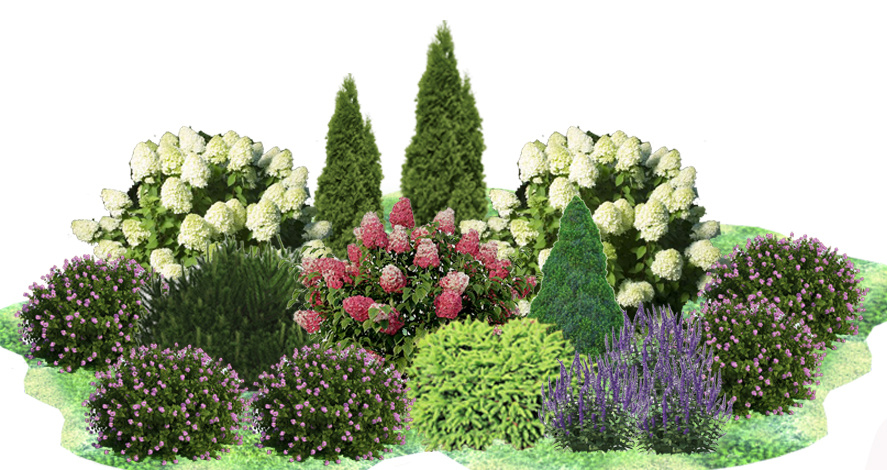 Парадная клумба — это визитная карточка любого участка, которая создает первое впечатление и радует глаз каждого прохожего. Она расположена у входа и выполнена в гармоничном стиле, подчеркивая индивидуальность любого двора. Сегодня будет новая схема парадного миксбордера с подробным описанием. Получилась такая яркая клумба, которая радует глаз своей гармоничной композицией. В центре внимания — пышные гортензии, чьи крупные соцветия меняют оттенки в зависимости от сезона, создавая эффектные акценты. 1. Гортензия метельчатая Лайм Лайт Высокий мощный кустарник, высотой до высотой до 2,5м. Зацветает в середине лета крупными соцветиями нежно-зеленого оттенка, а затем постепенно окрашиваются в кремово-белый цвет. 2. Туя западная Смарагд Яркая зеленая хвоя, красивая пирамидальная форма кроны- это за что любят сорт Смарагд. Для этой композиции выигрышно будут смотреться туи разного возраста, разной высоты. 3. Сосна горная Пумилио Это медленнорастущий сорт сосны до 1,5 метров в высоту. Облад