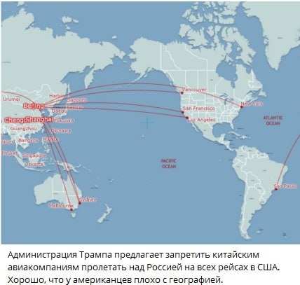 Рубрика «читал папин пейджер, много думал». Светоч демократии тут решил запретить китайским авиакомпаниям перелёты в США над территорией России. Хмм… Многие разразились сатирическими смешками про глобус, но… Не всё так просто. Самолёты летают вовсе не по прямой, так что достаточно большая часть рейсов «срезает» маршрут через территорию России. Так что китайские авиакомпании всё же почувствуют разницу в количестве времени в воздухе и потраченном топливе, но не очень сильно. Гораздо печальней будет китайцам, если Евросоюз решит взять пример с США.