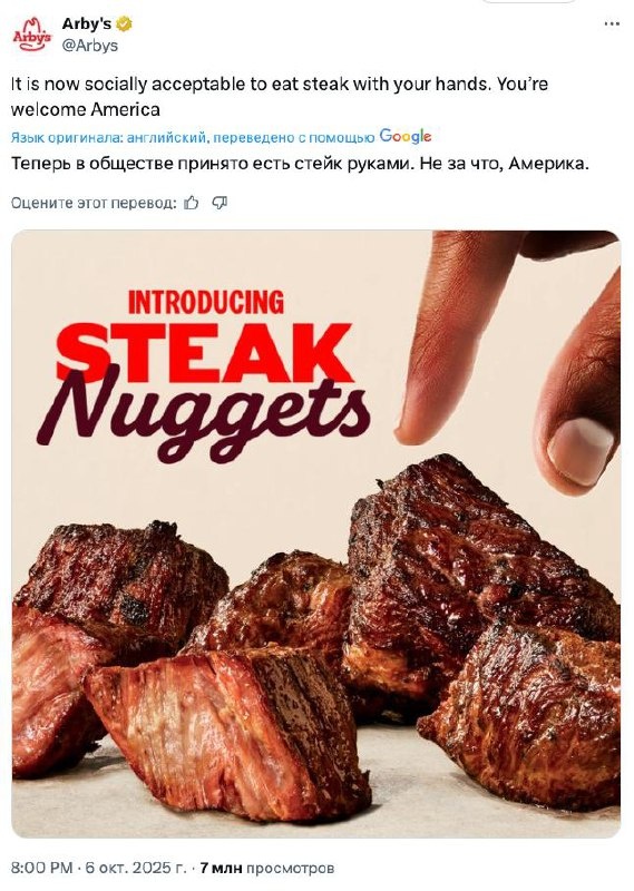 🇺🇸 Американцы изобрели шашлык: Повара американской сети Arby's просто порезали мясо, обжарили его на открытом огне и представили как «стейк-наггетсы».