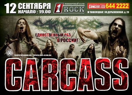 12 сентября 2009 года стало знаменательной датой для российской метал-сцены — легендарная группа Carcass впервые выступила в Москве. Концерт состоялся в клубе 1ROCK и стал настоящим праздником для поклонников экстремального металла. На сцене появились: * Джефф Уокер — вокал, бас-гитара; * Билл Стир — гитара, вокал; * Майкл Эмотт — гитара; * Дэниел Эрландссон — ударные; * Кен Оуэн — оригинальный барабанщик группы (присутствовал как историческая фигура). Начало выступления предваряла группа Melissa, однако главным событием вечера, конечно же, стало появление самих Carcass. Сцена была заполнена восторженными фанатами, готовыми к мощному выступлению. Звуковое оформление концерта было на высочайшем уровне. Группа представила программу, включающую как классические композиции, так и более новые работы. 1. Corporal Jigsore Quandary 2. Buried Dreams 3. Carnal Forge 4. No Love Lost 5. Empathological Necroticism 6. Incarnated Solvent Abuse 7. Edge Of Darkness 8. This Mortal Coil 9. Embodiment