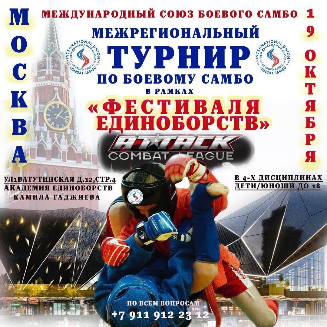 19 октября в Москве пройдет межрегиональный турнир по боевому самбо в рамках Московского Фестиваля единоборств 🤼 Турнир пройдет в Академии единоборств Камила Гаджиева. Внимание! Только дети/юноши!!! (Фестиваль молодёжный).