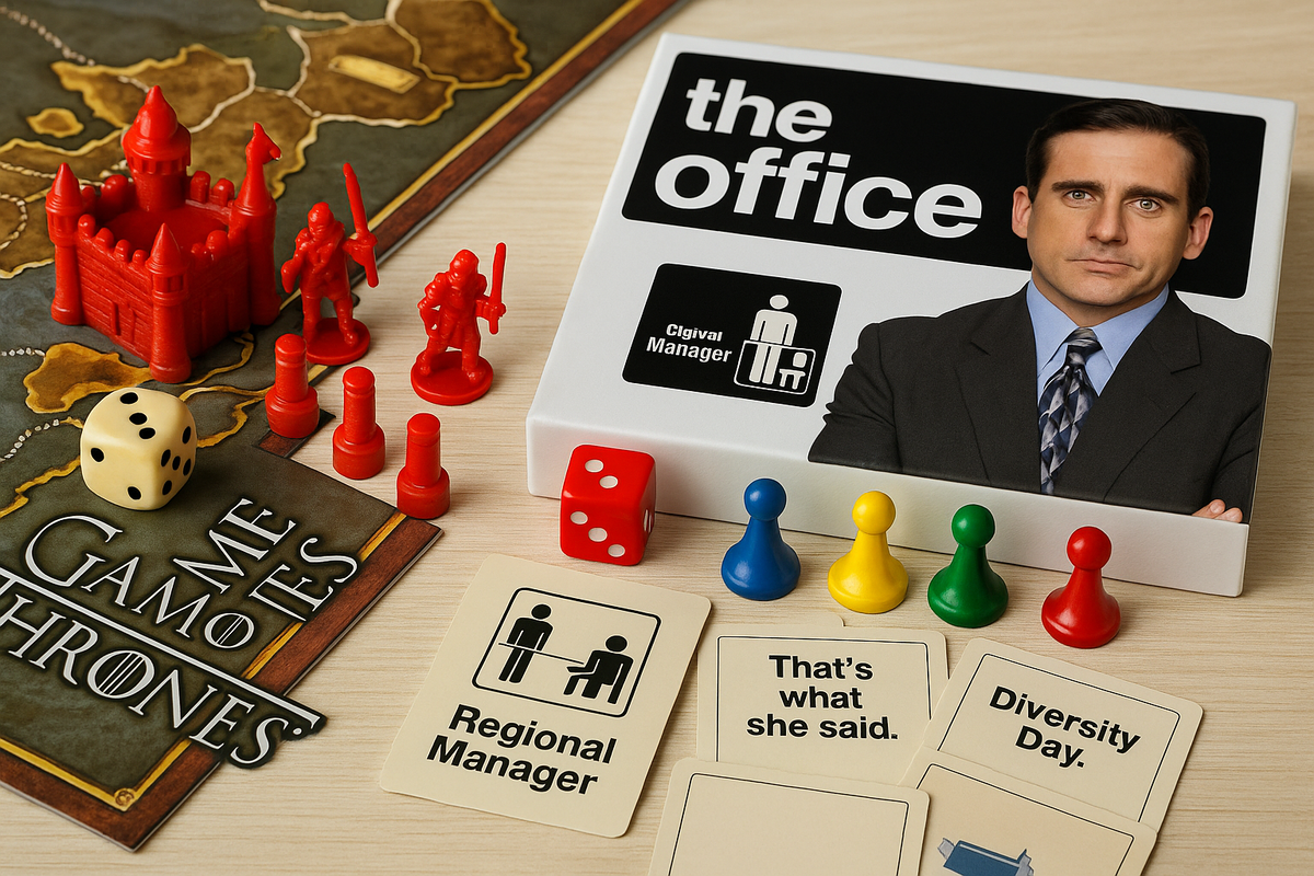 Вот представьте: вечер пятницы, вы достаёте коробку, на обложке — Джон Сноу и Майкл Скотт. Игра обещает «высокую реиграбельность и корпоративное выгорание». Один ход — и вы уже спорите, кто сегодня будет пить кофе в «Дандер Миффлин», а кто — устраивать переворот в Винтерфелле.