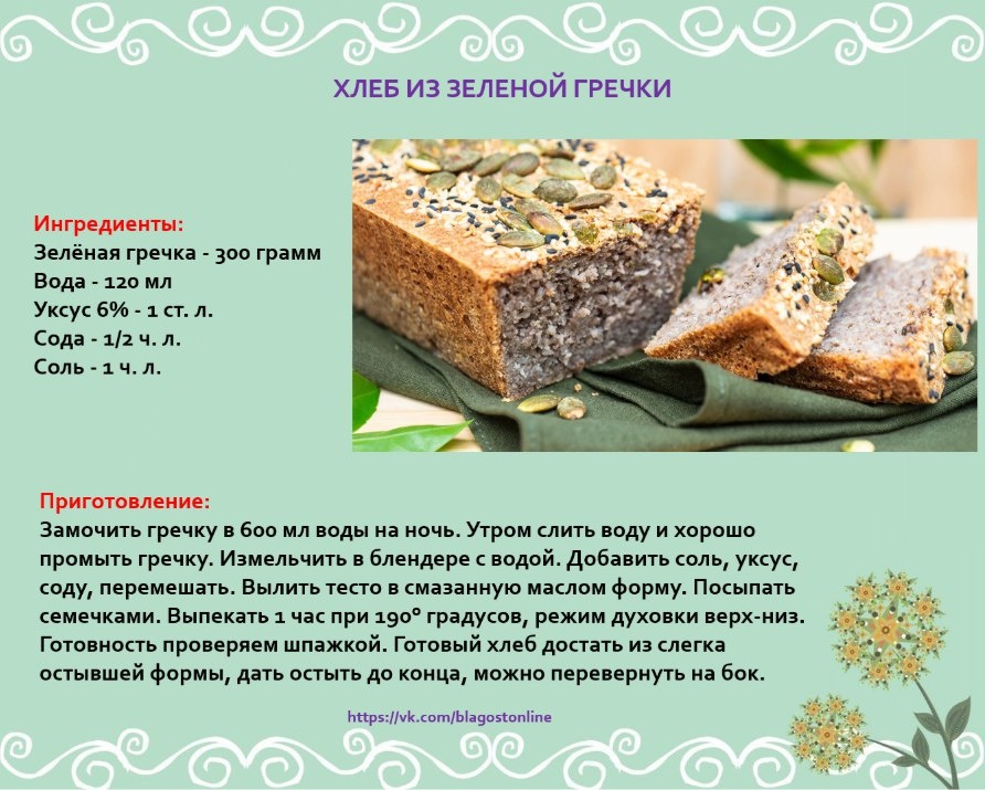 🍞 ХЛЕБ ИЗ ЗЕЛЕНОЙ ГРЕЧКИ 🌀 Ингредиенты: Зелёная гречка - 300 грамм Вода - 120 мл Уксус 6% - 1 ст. л. Сода - 1/2 ч. л. Соль - 1 ч. л. 🌀 Приготовление: Замочить гречку в 600 мл воды на ночь. Утром слить воду и хорошо промыть гречку. Измельчить в блендере с водой. Добавить соль, уксус, соду, перемешать. Вылить тесто в смазанную маслом форму. Посыпать семечками. Выпекать 1 час при 190° градусов, режим духовки верх-низ. Готовность проверяем шпажкой. Готовый хлеб достать из слегка остывшей формы, дать остыть до конца, можно перевернуть на бок.