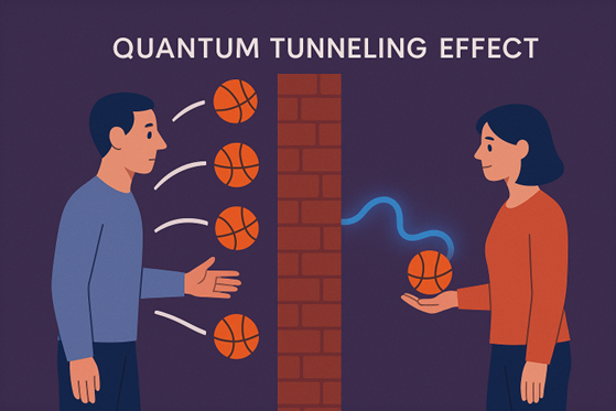 Это называется туннельным эффектом. Частица как бы проникает через туннель в препятствии и оказывается на другой стороне. В теории этот эффект был описан ещё в 1920-х годах русским физиком Георгием Гамовым и американцами Рональдом Герни и Эдуардом Кондоном.
