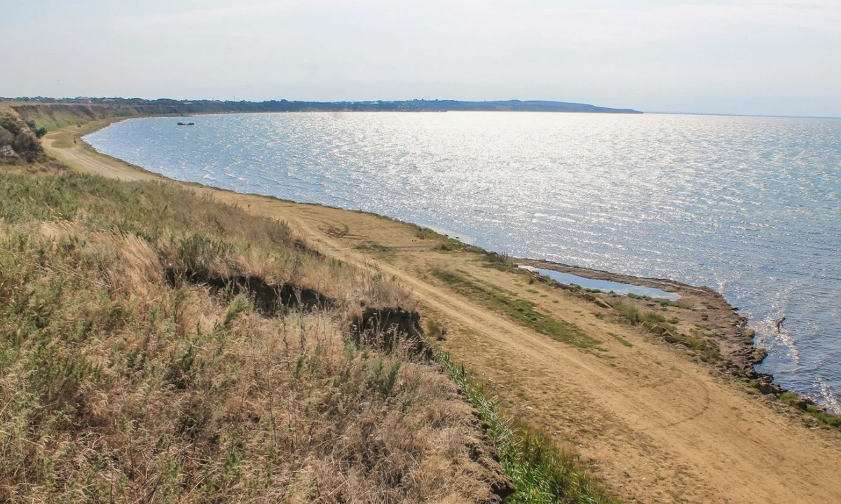 Пляж у посёлка Сенной на Азовском море выделяется длинной песчаной полосой и ровным прибоем.