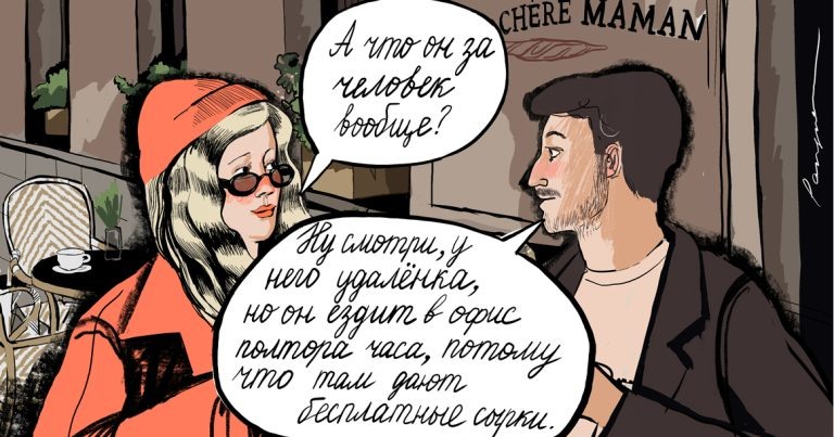 В ресторане «Шер Маман»: — По идее, я хотела бы вообще не работать, но просто мне уже 41, у меня акции на богатого мужа совсем упали. — Ну а что он за человек вообще?