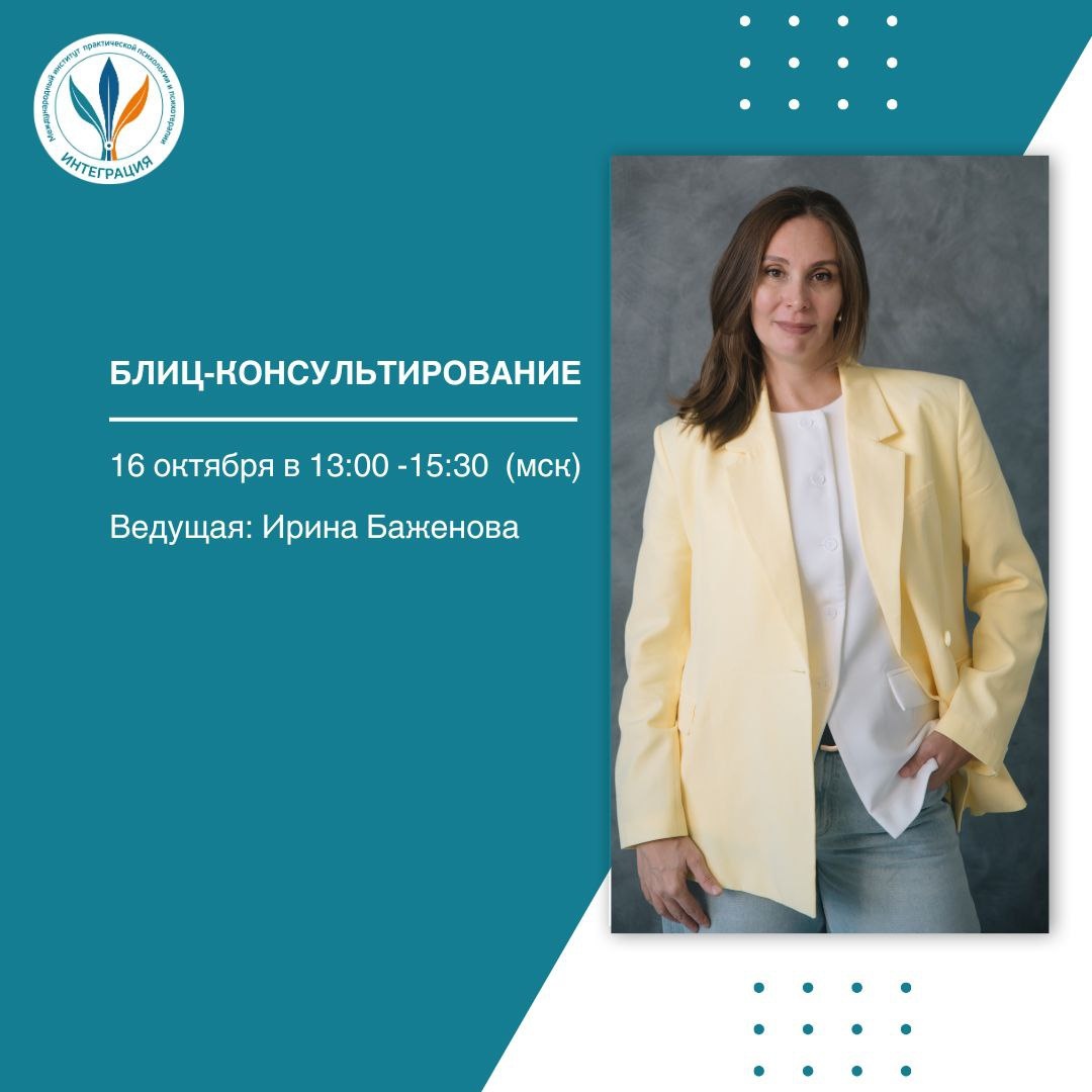 ➡ В институте «Интеграция» следующее блиц-консультирование состоится 16 октября с 13:00 до 15:30 (МСК) с Ириной Бажановой — психологом, специалистом в телесно-ориентированном подходе, аккредитованным супервизором ОППЛ, аккредитованным обучающим личным терапевтом ОППЛ, действительным членом ОППЛ, преподавателем ОППЛ национального уровня, преподавателем МИППиП «Интеграция».