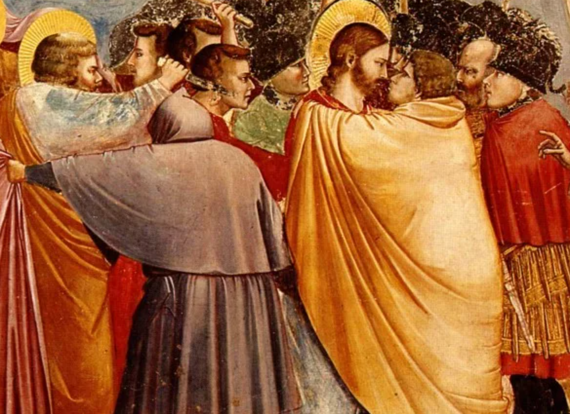 Самый ранний знаменитый поцелуй - предательский поцелуй Иуды, описанный в Евангелиях. Джотто ди Бондоне запечатлел его на фреске в капелле Скровеньи: Иуда с закрытыми глазами приближается к Христу, прикрывая его плащом. Иисус спокойным взором смотрит на ученика, который предаёт его поцелуем, опознавая для стражников.