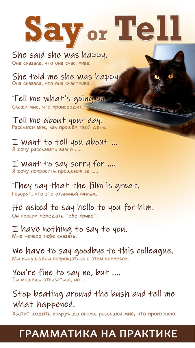 Say и tell используются по-разному. • После tell обязательно нужно уточнить, кому это говорится. • После say обычно идёт какая-то информация. Упоминать кого-то, кому это говорится, не обязательно. Если всё-таки это нужно - добавляем to.