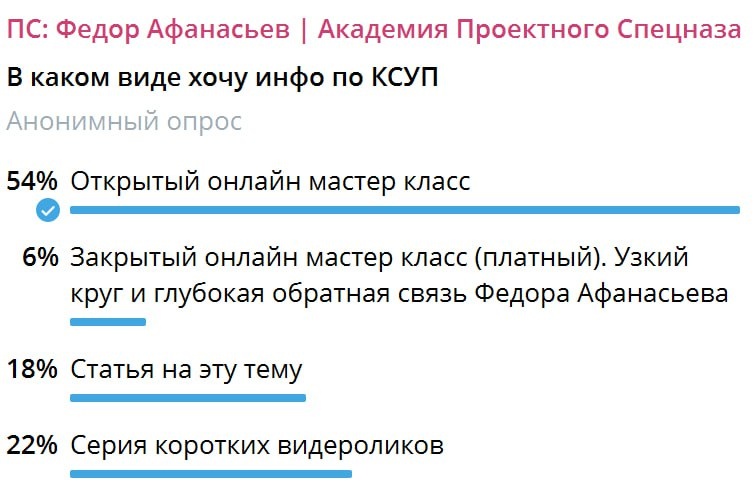 Спасибо всем кто проголосовал. по КСУП Первое место набрал онлайн мастер класс. Второе - видео ролики, третье статья на тему. Так и сделаем. 20 октября в 19мск я проведу мастер класс на тему "Как быстро навести порядок в проектах компании?". До этого на следующей неделе сделаю несколько постов на тему и короткие ролики, чтобы вы поглубже вникли в эту тему. Кто не задумывался на эту тему - самое время задуматься. Если в вашей компании не настроено проектное управление - то половина компании по сути работает неэффективно. Если у Вас проектный бизнес - то 100% компании работает неэффективно. И объем потерь в деньгах и времени по факту на порядки превышает то, как вы это оцениваете. Вот об этом и поговорим. Как настроить системное управление проектами в компании (КСУП), и сделать это быстро и без сильных затрат времени. Отметьте себе в календаре. 20 октября 19мск. Чуть позже дам детали.