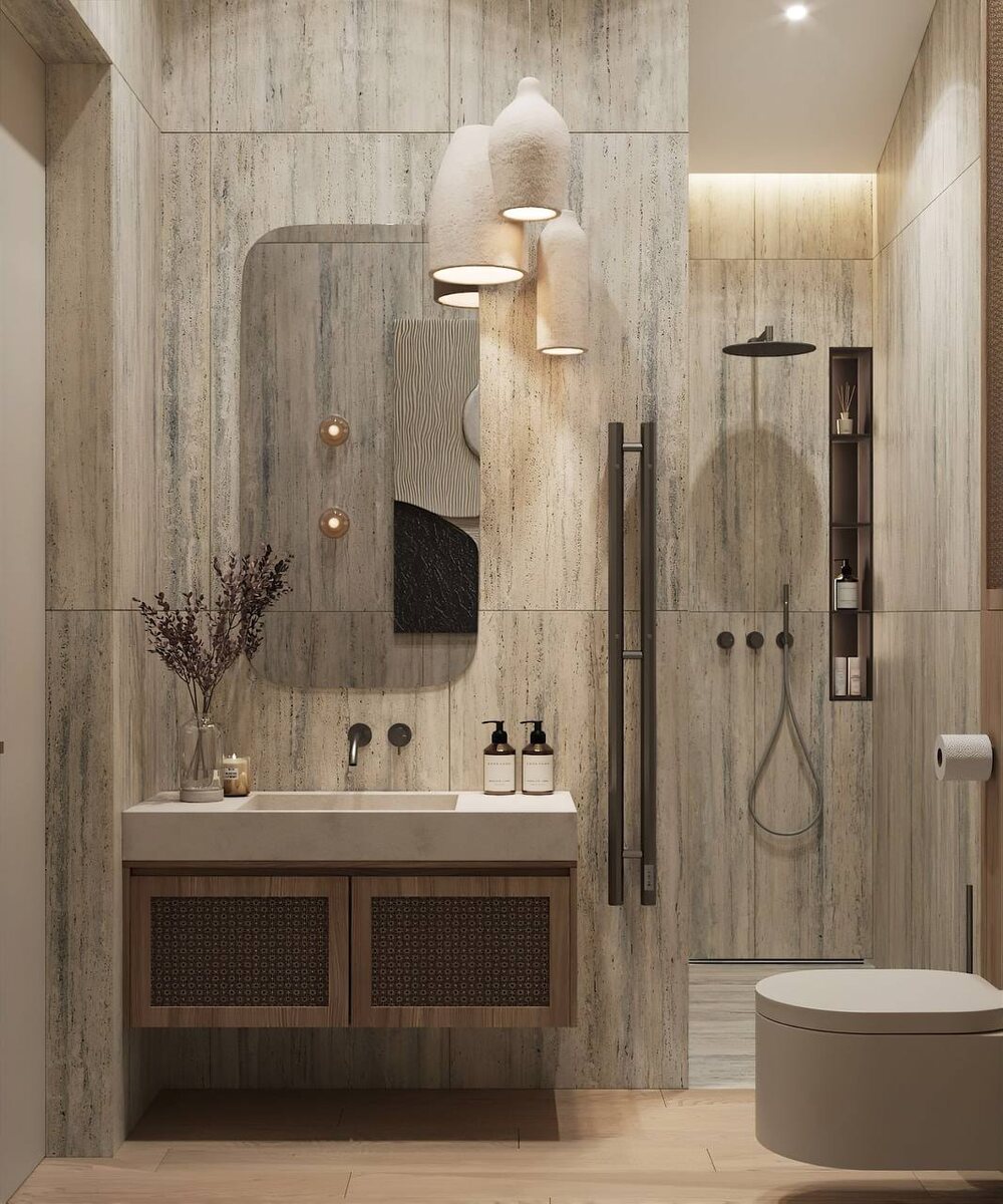 Дизайн ванной мастер в загородном доме, кп Новая жизнь 150 м2 | Продолжение природной эстетики ☘️ Этот проект органично развивает единую природную концепцию, объединяющую все пространства дома. Санузел становится продолжением философии гармонии с природой, где каждая деталь создаёт атмосферу спокойствия и умиротворения. Ключевые элементы дизайна😎: • Натуральные материалы: Специально подобранная плитка с выразительной природной фактурой формирует основу образа, подчёркивая связь с естественной средой. Читайте продолжение 👇