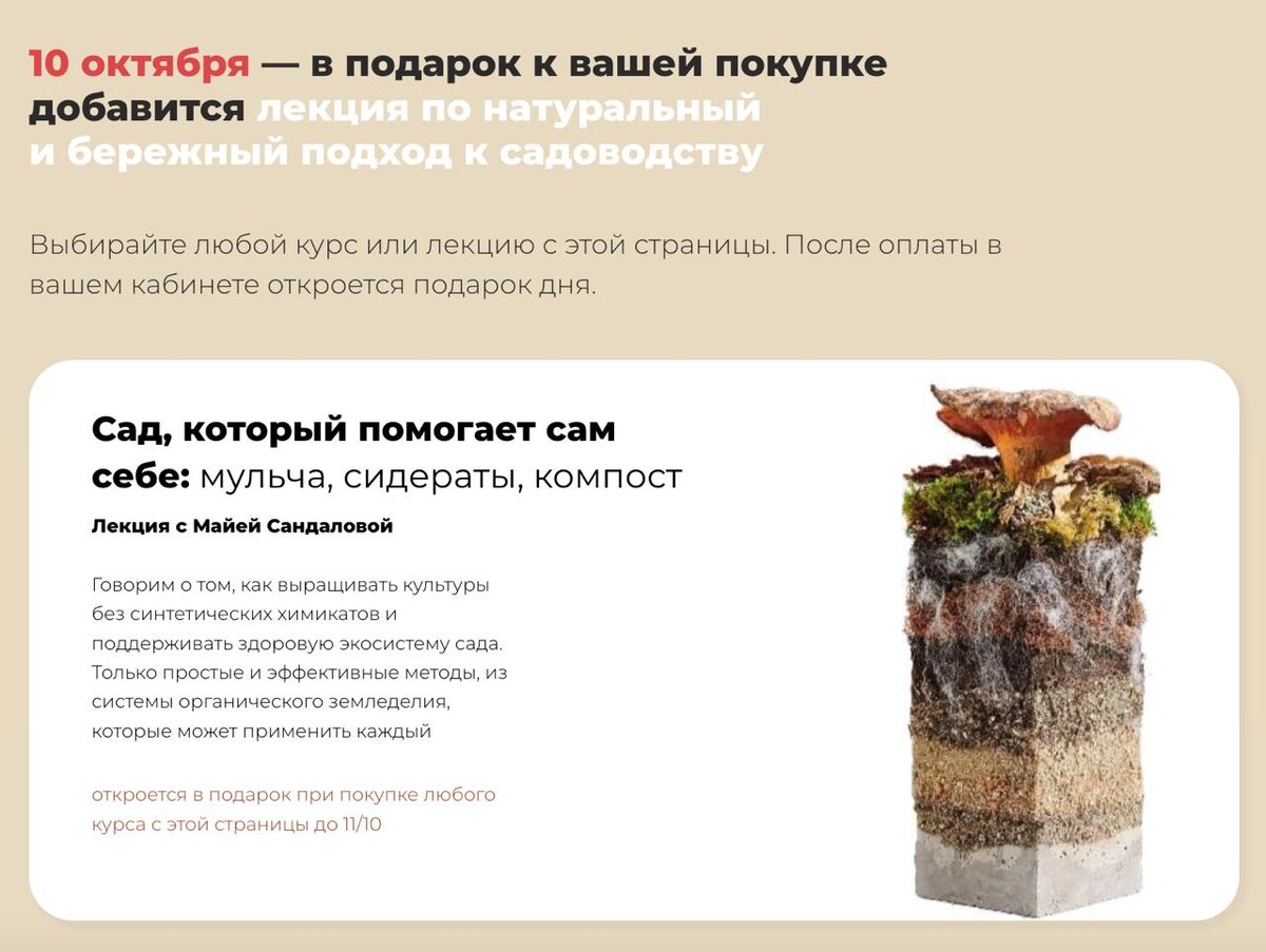 Друзья, осталось три дня, чтобы присоединиться к осенней неделе знаний. Каждый день здесь открываются новые подарки. 10 октября : подарок дня — лекция Майи Сандаловой про про сад, который помогает сам себе. Говорим о простых и надёжных приёмах, которые помогают сохранить почву, повысить урожай и не перегружать себя лишней работой. Без сложных терминов — только то, что действительно работает и подходит каждому. Подарок добавится автоматически после оплаты любого курса с этой страницы до конца дня. 👉 Посмотреть, что открыто сегодня