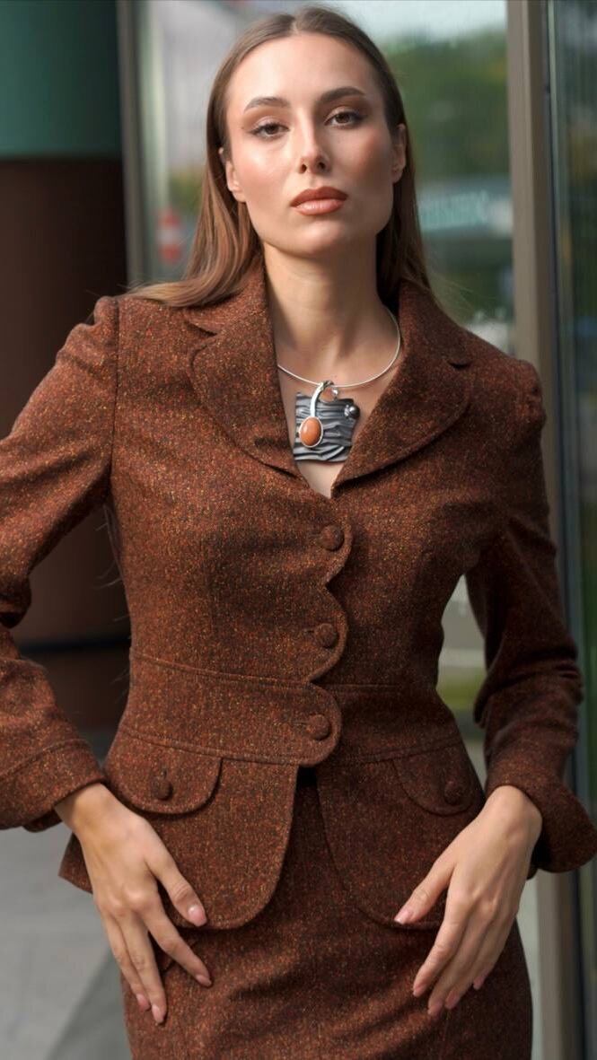 Смотрим ближе на наш костюм. 👉🏻Обратите внимание на созвучность линий кроя на жакете и юбке. 🟤Все детали выполнены в полукруглой мягкой форме, как бы уводящей от официоза английского костюма. 🟤Воротник переходит в фигурную застежку по фестонам передней полочки. 🟤Форма клапанов повторяет полукруглую баску. Мягкие рельефы с защипами по юбке плавно переходят в фестоны низа юбки. 🟤Такое ощущение, что художник рисовал все эти плавно переходящие линии не отрывая карандаша. 🟤И только шлицы на юбке и на баске жакета сохранили прямую линию. 🟤Романтический образ строгому жакету придают и объёмные рукава со складочками по окату рукава. Да, деловая, но ведь ЖЕНЩИНА ! Ждём ввас в салоне ➡️ м.Крылатское, «ТЦ Рублевский», секция 11 Подписывайтесь на наш telegram PRAMOSHOP