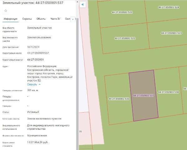 Название: Продажа земельного участка с кадастровым номером 44:27:050901:537, расположенного по адресу: город Кострома, поселок Гари