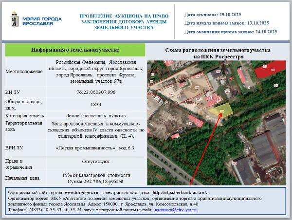 Название: Российская Федерация, Ярославская область, городской округ город Ярославль, город Ярославль, проспект Фрунзе, земельный участок 97в Канал: Госземля Ярославская область Область: обл Ярославская Район: г.о. город Ярославль Населенный пункт: г Ярославль Российская Федерация, Ярославская область, городской округ город Ярославль, город Ярославль, проспект Фрунзе, земельный участок 97в Локация: Смотреть на карте ВРИ: Легкая промышленность Кадастровый номер: 76:23:060307:996 Кадастровая стоимость: 1951907.86 Вид сделки: Аренда Площадь: 1834 м² Начальная цена: 292786.00 руб. Дата завершения: 24.10.2025 Подробнее: ГИС ТОРГИ #госземля #земляотгосударства #земля #земельныйучасток #земельныеторги #торги #аукцион #арендаземли #аренда #ярославскаяобласть