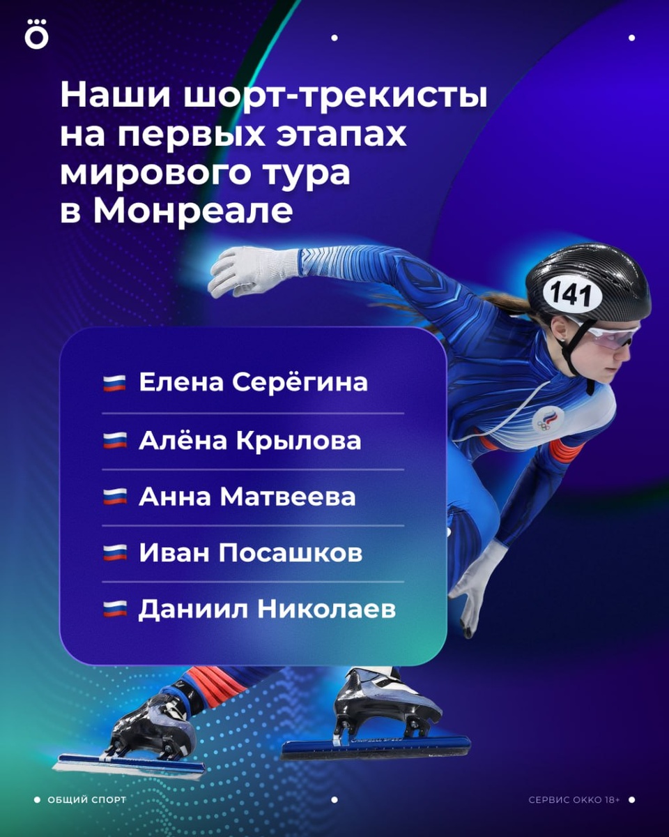 ⛸ В Монреале стартует Мировой тур по шорт-треку. Турнир является отборочным к Зимним Олимпийским играм в Милане. В Канаду прилетели и наши спортсмены. Поболеем за Алёну Крылову, Елену Серёгину, Анну Матвееву, Ивана Посашкова и Даниила Николаева. Смотри Мировой тур 11, 12, 18 и 19 октября в Okko. Начинаем завтра в 20:35 с комментариями Эмины Малагич и Андрея Голованова: okko.tv/s/u92