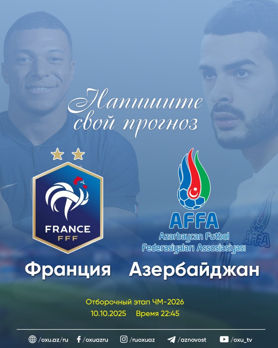 Напишите свой прогноз!!! Отборочный этап ЧМ-2026 10 Октября Время 22:45 #ruoxuaz #СборнаяАзербайджанапофутболу #СборнаяФранциипофутболу ✈️ Новости Азербайджана 🔗 Написать нам