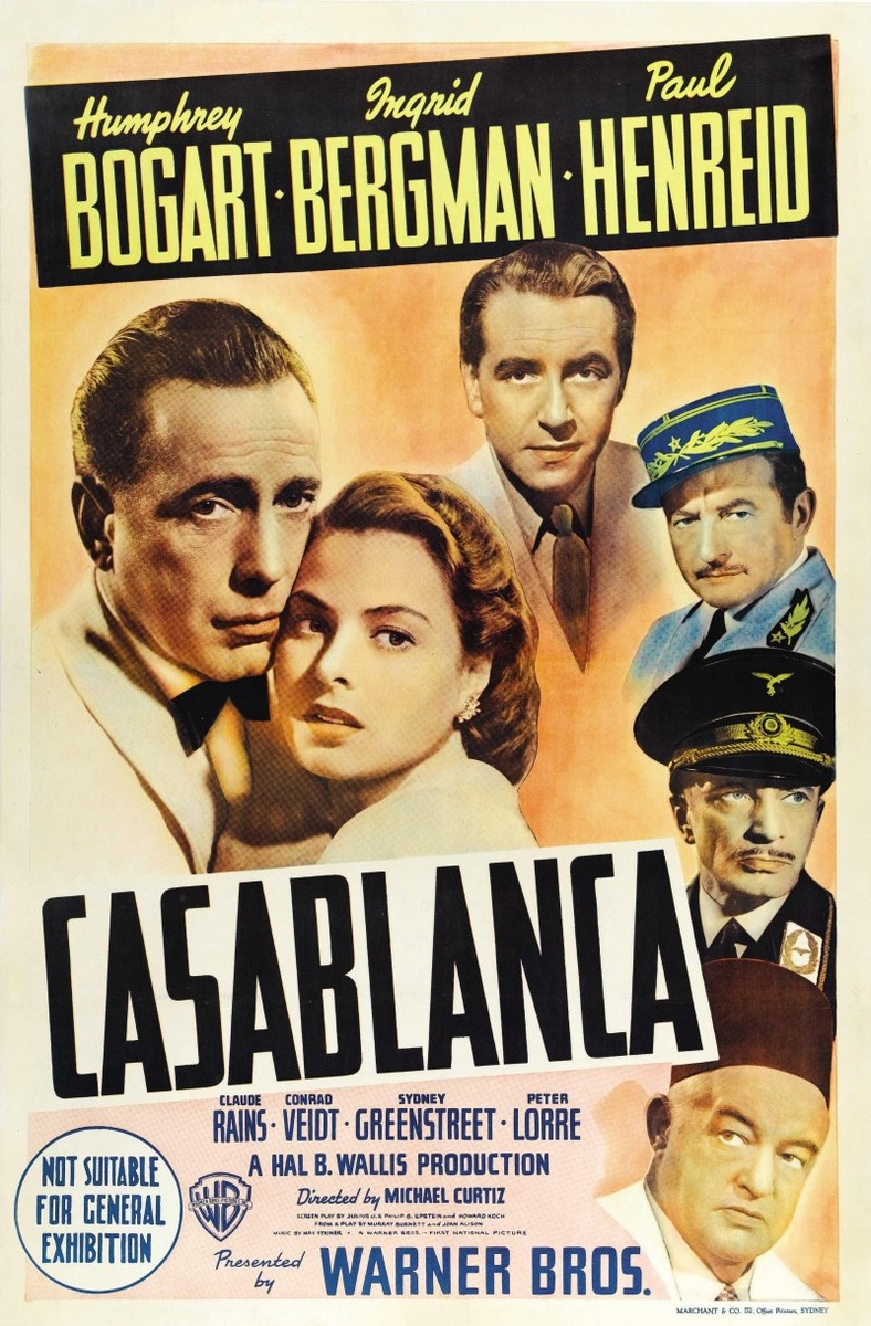 Ленту Майкла Кертиса "Касабланка" особо представлять не надо. Куча премий (3 Оскара: лучший фильм, режиссер, сценарий), включение во всевозможные списки пр. И он действительно хорош. Правда, когда снимали эту картину, о таком успехе никто не думал. Сценарий по пьесе "Все приходят к Рику" переписывали несколько раз, причем прямо в процессе съемок, поэтому актриса Ингрид Бергман никак не могла понять, что ей играть. Она не знала, с кем из двоих мужчин останется ее героиня. При этом бюджет был весьма скромным, а Богарт впервые снимался в романтической роли... Но что-то сработало. То ли искра проскочила между Богартом и Бергман, то ли сказалось то, что на вторых ролях снимались отличные актеры, эмигрировавшие из Европы: Фейдт, Лорре, Хенрейдт, Кински. То ли очень удачным оказалось сочетание любовной линии и антифашистской направленности. Но факт остается фактом: фильм взлетел тогда и востребован сейчас. Настолько, что существует бар "У Рика", который обустроили в Марокко уже в нашем веке
