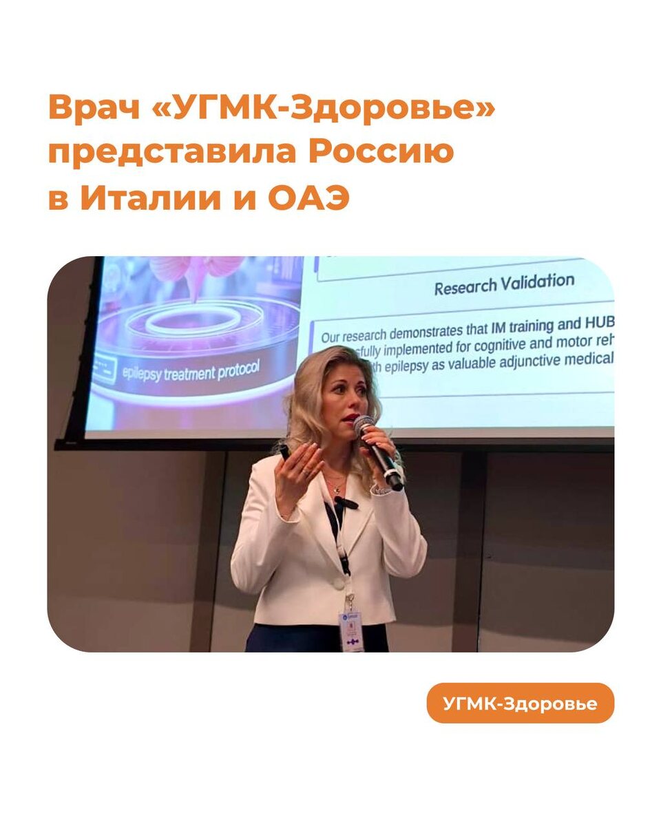 Врач «УГМК-Здоровье» представила Россию в Италии и ОАЭ Эпилептолог клиники, заведующий нашим Центром мозговых дисфункций и эпилепсии Татьяна Томенко выступила на международных встречах на тему диагностики, лечения и реабилитации детей с эпилепсией. 🧡 На 7-м Международном курсе EPIPED-EEG Татьяна Рафаиловна в качестве тьютора прочитала лекцию по фотосенситивной эпилепсии — форме заболевания, при которой приступы могут провоцироваться ярким или мигающим светом. Курс прошёл с 27 сентября по 1 октября 2025 года в Болонье (Италия) и был посвящён интерпретации ЭЭГ и видео-ЭЭГ при различных формах эпилепсий. 🧡 На Европейско-Арабском медицинском конгрессе (EAMC) Татьяна Рафаиловна в составе команды Уральского федерального университета представила доклад о современных подходах к реабилитации детей с эпилепсией. В нем она подчеркнула важность комплексной работы мультидисциплинарной команды — неврологов, физиотерапевтов, психологов и педагогов — для восстановления функций и улучшения качеств