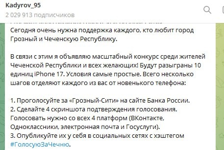😶 Кадыров объявил розыгрыш 10 iPhone 17 среди тех, кто проголосует за «Грозный Сити» за право быть на новой 500-рублёвой банкноте