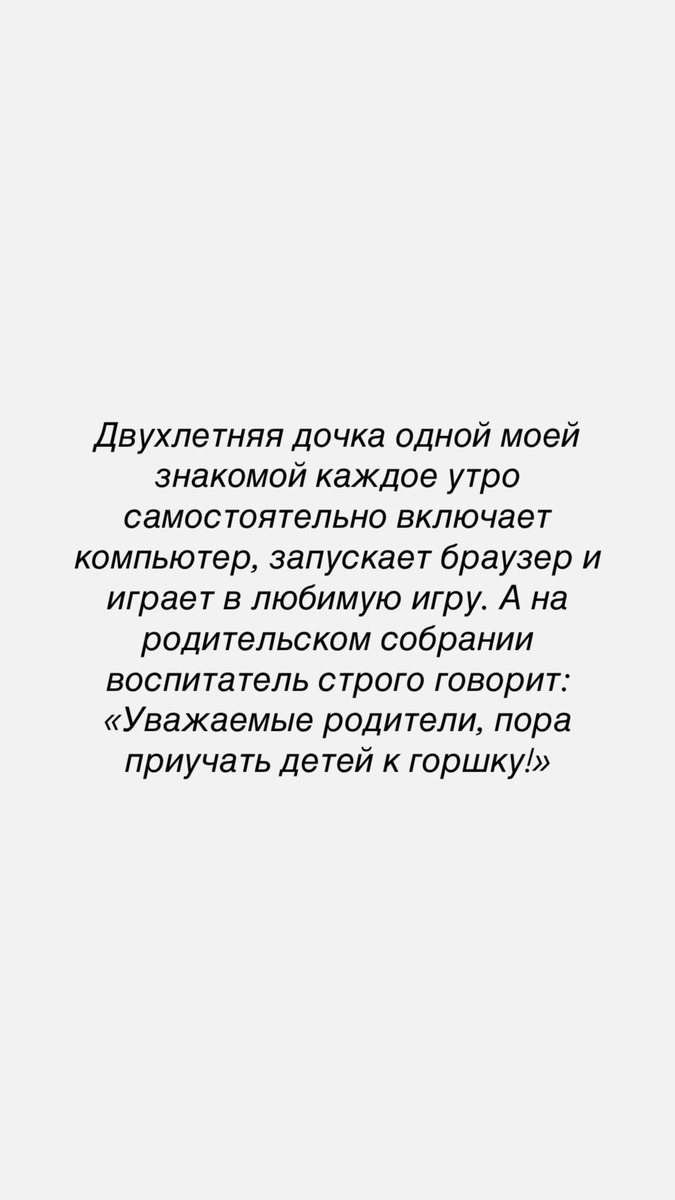 Двухлетняя дочка одной моей знакомой каждое утро самостоятельно включает компьютер, запускает браузер и играет в любимую игру. А на родительском собрании воспитатель строго говорит: «Уважаемые родители, пора приучать детей к горшку!»