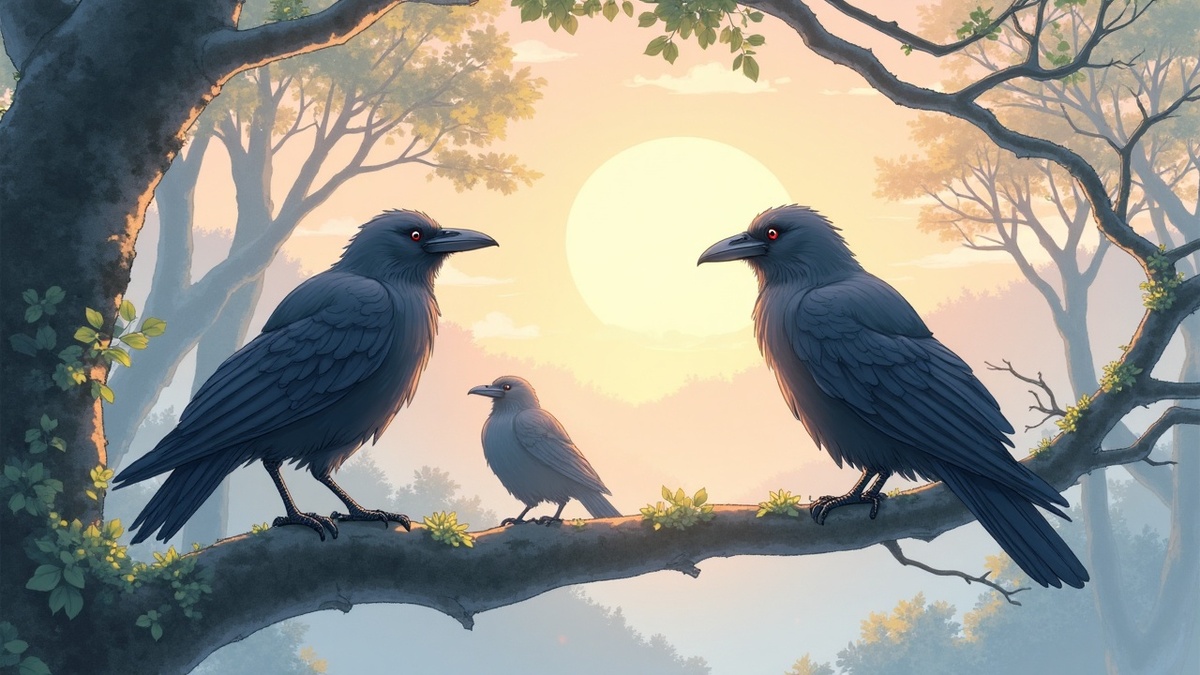 Давным-давно, когда мир только-только начал наполняться птицами, все вороны были одинаковые — серо-белые, словно облака на рассвете. Они жили дружно, каркали хором и любили блестящие вещи — бусинки, капельки росы, кусочки слюды. Но однажды в их мир пришла Зима — холодная, тихая и очень красивая. Она принесла с собой снежные метели и ледяной ветер. Вороны сначала радовались: кувыркались в снегу, катались по сугробам и ловили снежинки клювами. Однако вскоре пришёл Голод. Всё вокруг укрылось снегом, и не стало видно ни зёрнышка, ни жука. Вороны собрались на совет. — Что же нам делать? — каркнул старший ворон, Мудроглаз.