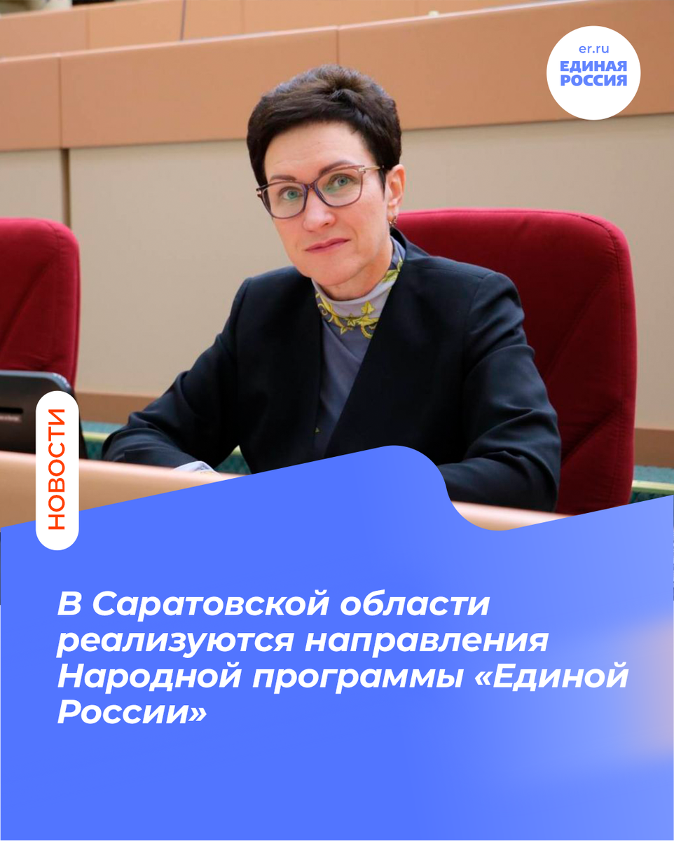 Руководитель фракции «Единая Россия» в Саратовской областной Думе Ирина Колесникова подчеркнула, что реализуемые региональные проекты отражают задачи, заложенные в Народной программе.