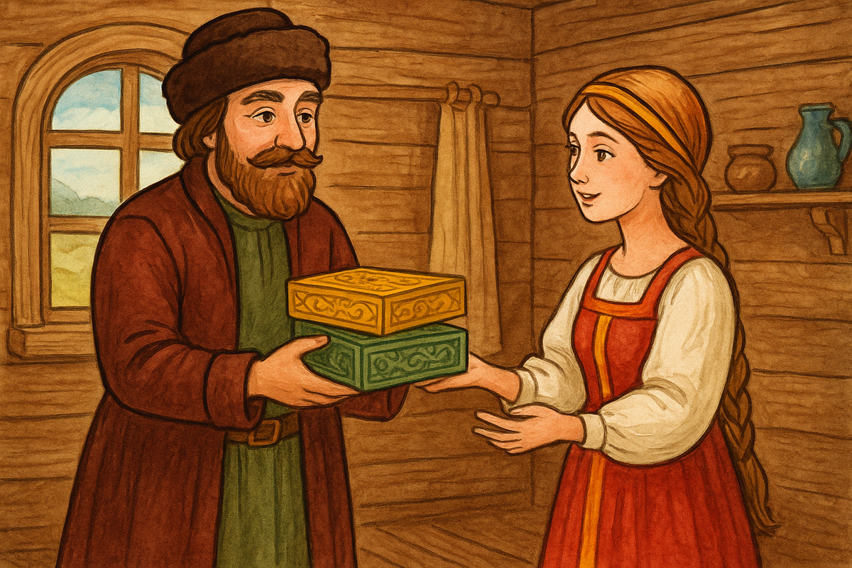 В тридевятом царстве, в тридесятом государстве жил купец один и была дочь у него, Авдотья, красавица писаная, умница и рукодельница. Купец постоянно в разъездах, в далёкие края за товарами заморскими ездил, а дочь оставалась надолго дома одна - уже и пряжи напряла, и рушников навышивала, складывать некуда. По соседству жил ещё один купец и тоже с дочерью. Прибегает как-то соседка к нашей красавице, похвастаться подарками батюшкиными. Сладости принесла. Коробочку одну открыла, а там шоколад. - Смотри, что тятенька от арабов привёз. Такого шоколада ты ещё не пробовала. Угостись, подруженька, немножко. Дорогой он очень. Попробовала купеческая дочь шоколад, плечиками пожала: - Хороша конфетка, да маловата. Ни самой наесться, ни други угостить вдоволь. Но спасибо и за это. Засела с этих пор в голове у нашей девушки мысль: как бы самой такое чудо приготовить да и угостить всю деревню. А тут и батюшка собирается в очередное путешествие к далёким берегам. - Батюшка, будешь ли ты в тех места