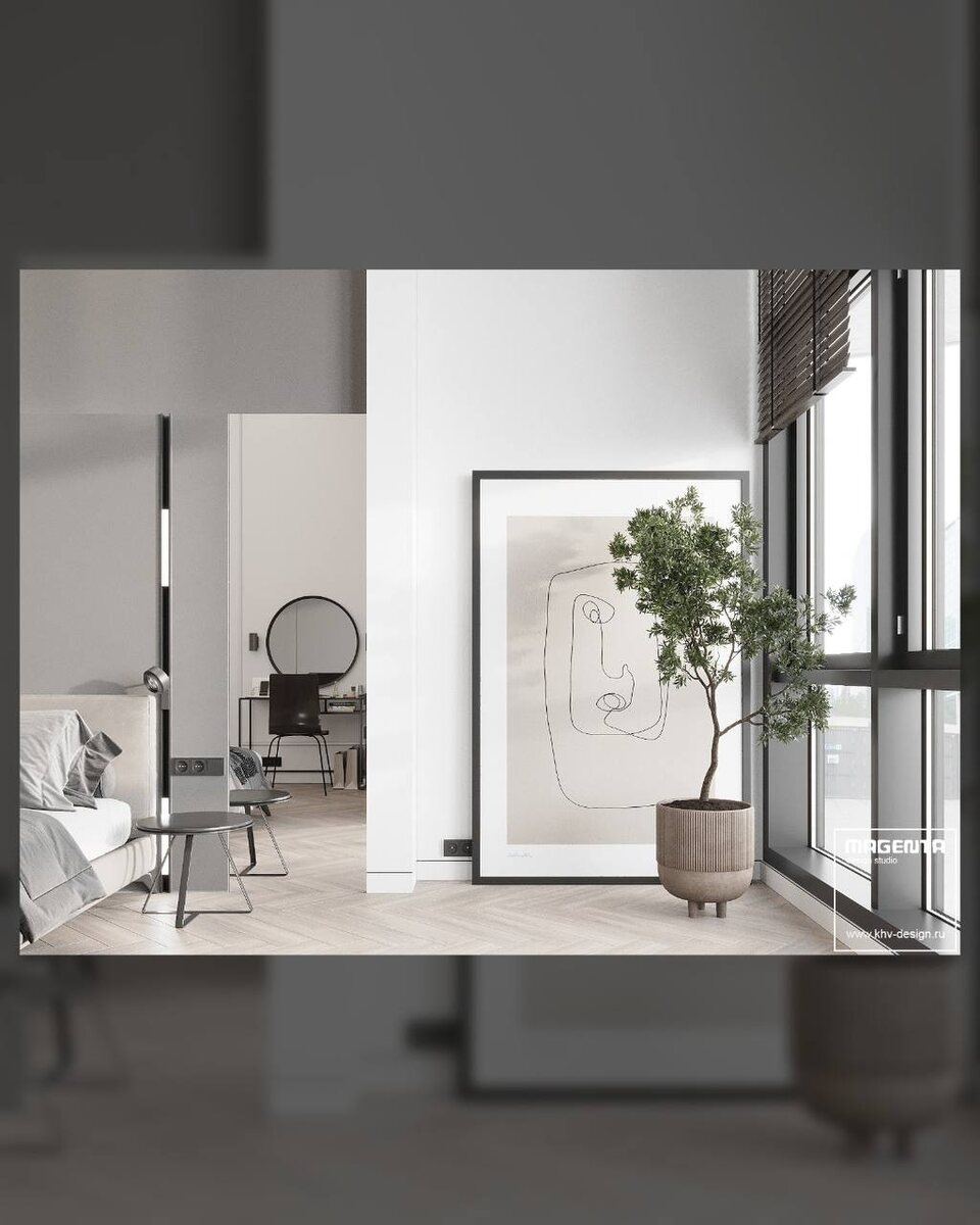 Современная спальня в минималистичном стиле Светлое дерево, нейтральные оттенки серого и бежевого создают атмосферу спокойствия и комфорта. Акцентные черные детали добавляют современности и лёгкое изящество. Большие окна наполняют пространство естественным светом, а продуманные детали — от панелей до зеркал — делают интерьер функциональным и стильным. Прикоснитесь к дизайну класса А: портфолио реализованных проектов — на сайте magentastudio.ru Magenta