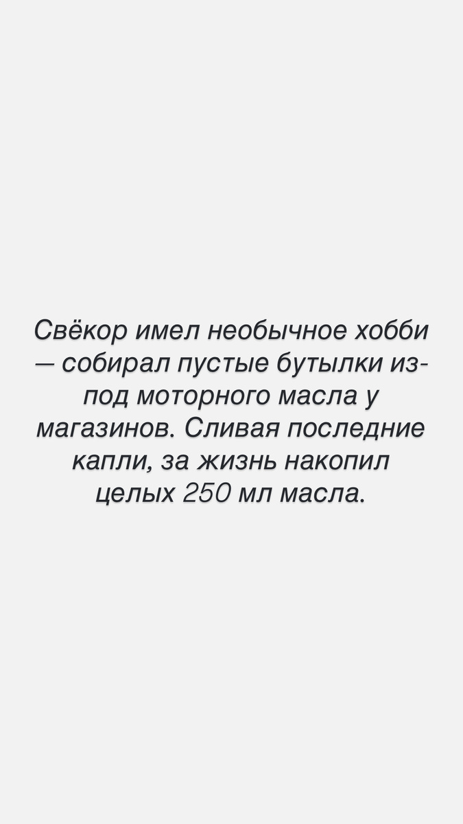 Свёкор имел необычное хобби — собирал пустые бутылки из-под моторного масла у магазинов. Сливая последние капли, за жизнь накопил целых 250 мл масла.
