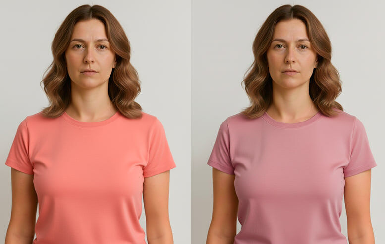 Сравните, два оттенка: слева теплый, справа холодный. По теории цветотипов должны подходить либо теплые, либо холодные. Но не специалист особо отличий не видит, да и специалисты не все видят.