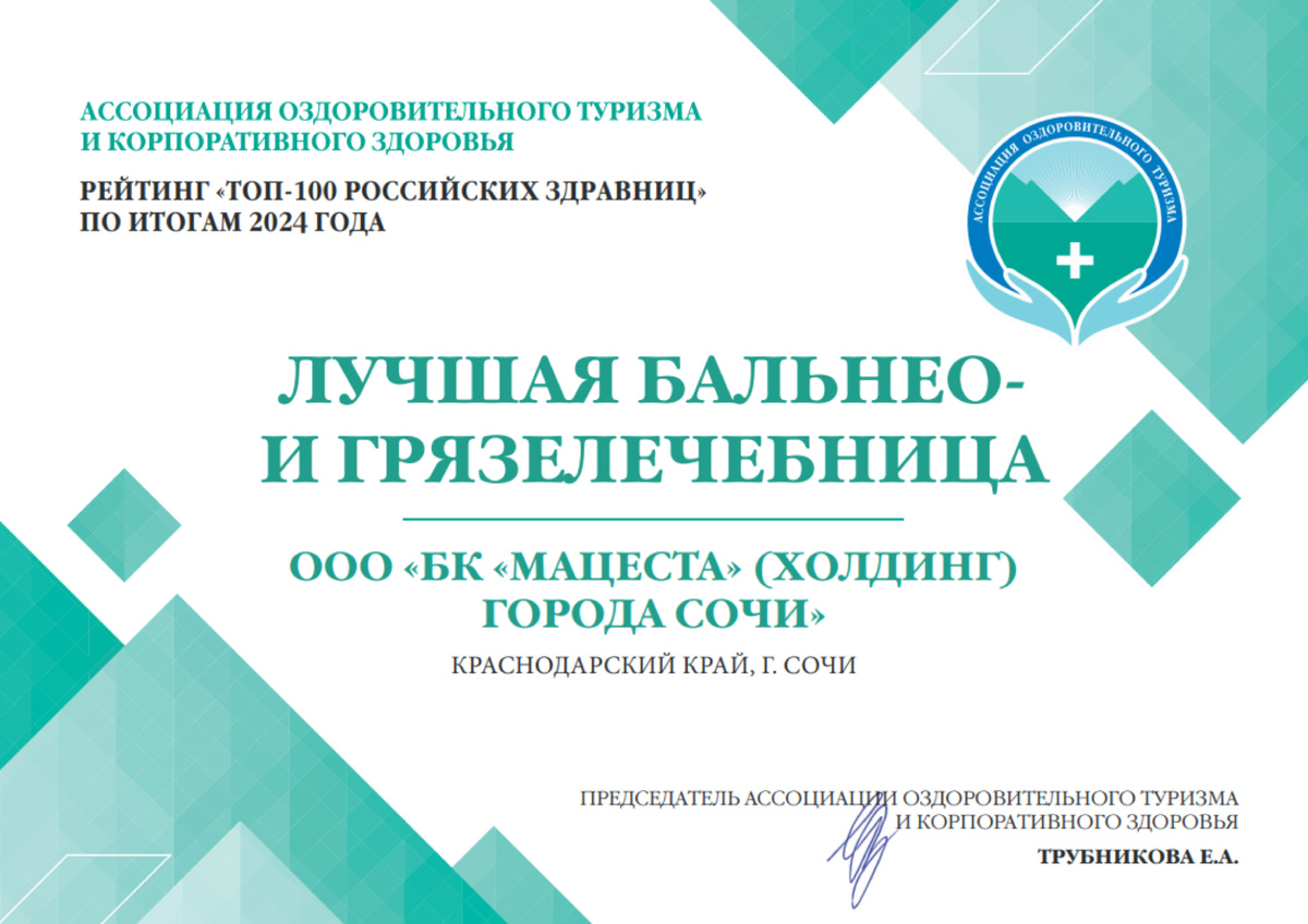 8 октября 2025 г. в Москве состоялась Торжественная церемония награждения лидеров Х юбилейного рейтинга инвестиционной привлекательности «ТОП-100 российских здравниц» по итогам 2024 года. Конкурс проводится Ассоциацией оздоровительного туризма и корпоративного здоровья (АОТ). В рамках ежегодного форума «Инвестиции в развитие здоровой страны. Цифры. Факты. Возможности» Бальнеологический курорт «Мацеста» удостоился награды «ЛУЧШАЯ БАЛЬНЕО- И ГРЯЗЕЛЕЧЕБНИЦА»! Это уже третий раз, когда «Мацеста» побеждает в данной номинации, что подтверждает нашу приверженность качеству и инновациям в области санаторно-курортного лечения. Мы гордимся тем, что наши усилия по улучшению качества предоставления медицинских услуг и внедрению передовых методов оздоровления получили столь высокую оценку экспертов сферы оздоровительного туризма. «Мацеста» выражает искреннюю благодарность Ассоциации оздоровительного туризма и корпоративного здоровья за признание наших достижений. Бальнеологический курорт «Мацеста»