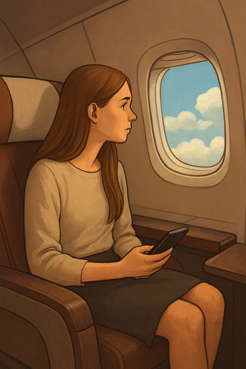 Салон первого класса встретил тишиной. Не было привычного гула голосов, запаха курток и дешёвых бутербродов. Здесь пахло кофе и чем-то, что она не могла определить – возможно, спокойствием. Кресла широкие, как объятия. Свет мягкий. Люди вокруг – молодые, её ровесники, но другие. Одеты просто, без блеска, без этих демонстративных сумок и ногтей, будто они и так знали, что всё у них в порядке.