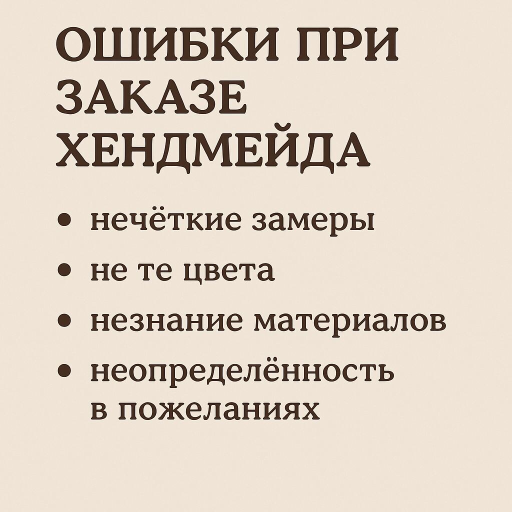 5 типичных ошибок при заказе ручной работы. Наверное, каждая мастерица сталкивалась с этим 😀. Когда человек вроде бы всё рассказал, выбрал,уточнил - а потом, оказывается, что результат не тот, что он представлял. На самом деле - это не из вредности, просто в процессе легко запутаться. Вот несколько типичных моментов, которые мешают и клиенту, и мастеру. ✔️ "Сделайте, как на фото"- но фото из Pinterest. У каждого мастера своя подача, материалы, узлы, стиль. Лучше сказать:"хочу в похожем стиле", и тогда получится уникально. ✔️"А можно завтра?" Ручная работа - не волшебная палочка. Узлы не плетутся со скоростью кликов. Лучше заранее обсудить срок, особенно если это подарок. ✔️"А я не знала, что цвет по-разному выглядит на фото. Телефон, освещение, монитор - всё искажает. Просите мастера показать фото при дневном свете - это от разочарования. ✔️"Ой, я передумала"- уже после оплаты. Такое бывает, но если изделие уже начато - мастеру сложно всё переделать. Лучше обсудить детали до ста