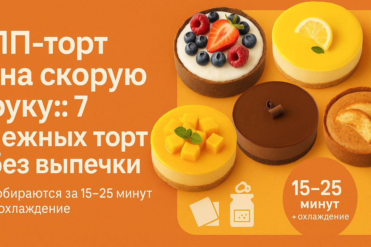 Привет! Я часто собираю торты без духовки, когда хочется что-то особенное «сейчас», а не завтра. Секрет прост: холодный крем на йогурте/твороге + аккуратная основа + правильная желирующая система. Ниже — 7 живых карточек без таблиц: точные граммы, диаметр формы, высота слоя, стабильность крема, время застывания. В каждом рецепте — ПП-замены, чтобы подстроить сладость/жирность под ваши цели. Поехали!