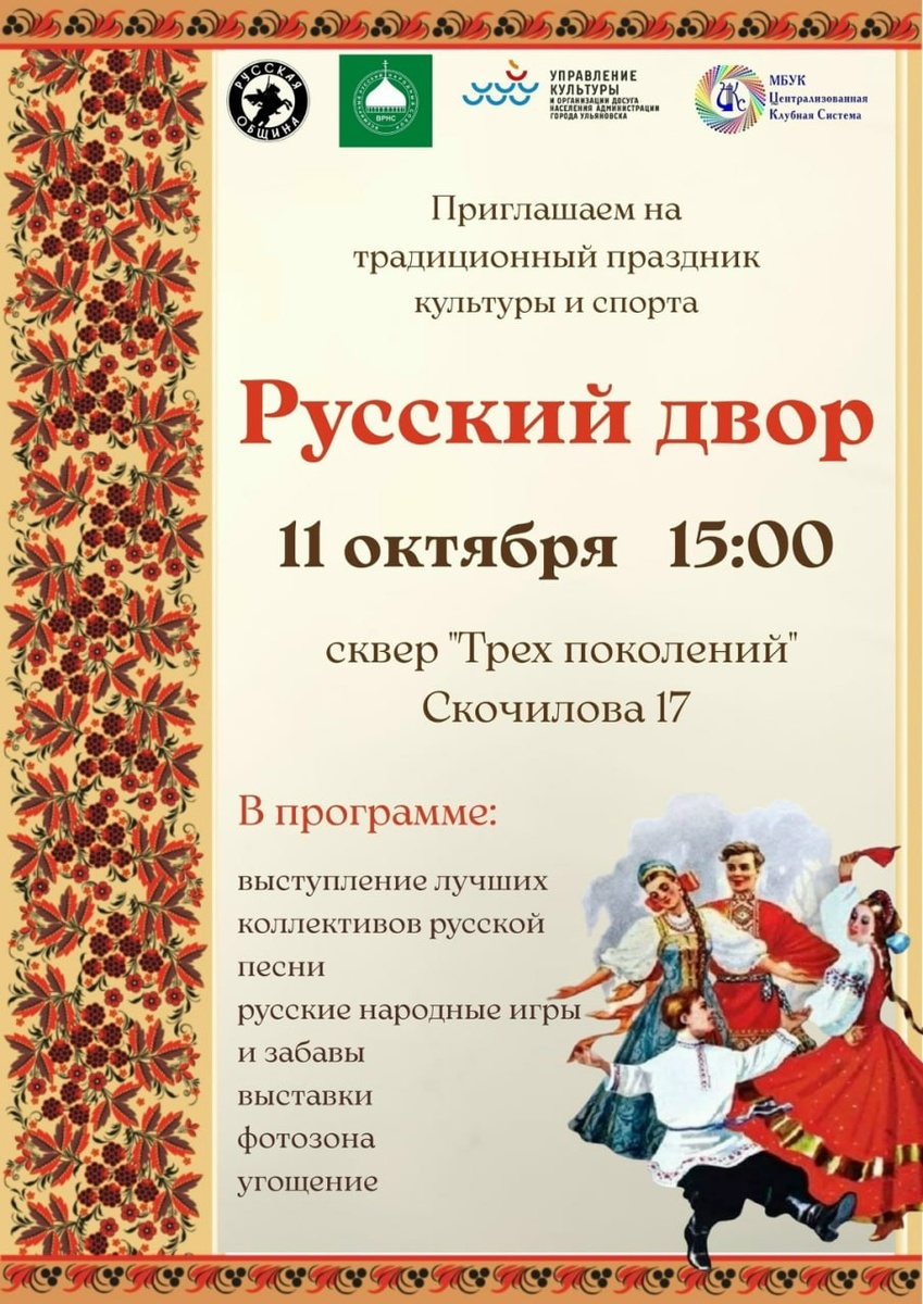 В Ульяновске в сквере Трех Поколений пройдет народный праздник «Русский Двор» Мероприятие состоится 11 октября в 15:00 по адресу улица Скочилова, 17. Гостей ждут душевные русские народные песни, хороводы под народные напевы и традиционные игры и забавы. Юные гости праздника смогут попробовать свои силы в народных эстафетах и конкурсах. Старшее поколение сможет насладиться мелодиями своей молодости и вспомнить забавы. Также будет организована фотозона для памятных снимков. Фото: Ульяновская Городская Дума Подписаться на наши новости