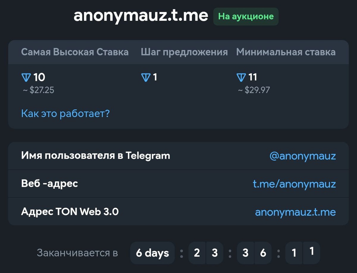 Кто-то хочет выкупить один из моих username @anonymauz 👀 До конца аукциона ещё 7 дней, желающие могут поучаствовать в торгах Весь список username @tonrests
