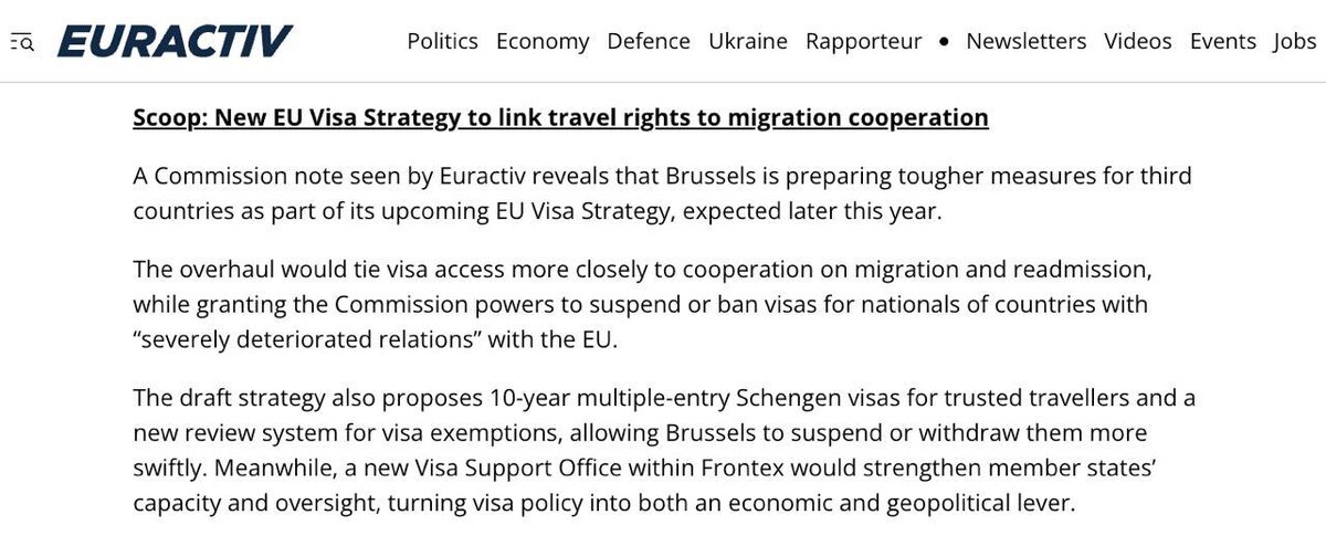 🛂 Еврокомиссия разрабатывает новую стратегию, позволяющую приостанавливать выдачу виз для стран с ухудшенными отношениями.