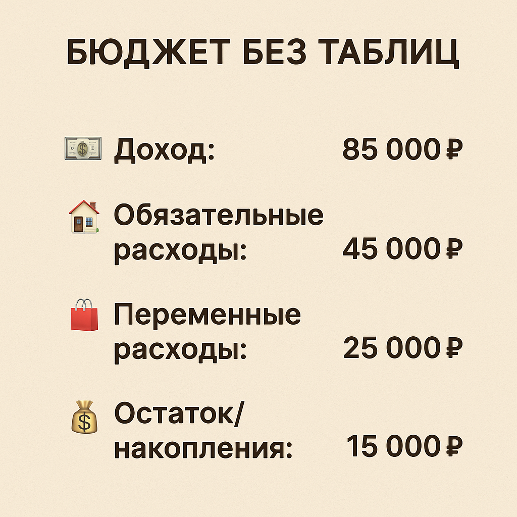 Вы не тревожитесь, хватит ли до зарплаты. Вы понимаете, сколько можете потратить на отпуск, подарки или новую технику. Бюджет - это не ограничение. Это инструмент, который даёт: Не всем нравятся таблицы. И это нормально! Главное - регулярность, а не формат. Варианты без таблиц: Создайте обычную заметку «Бюджет». Разделите её на разделы: Доход: 85 000₽ Обязательные расходы: 45 000₽ Переменные расходы: 25 000₽ Остаток/накопления: 15 000₽ Просто обновляй