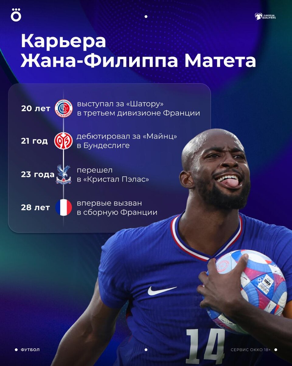 От третьего французского дивизиона до вызова в сборную за восемь лет. Невероятная карьера Матета 👍 Ждем дебют Жана-Филиппа в отборе на ЧМ. Смотри матч Франция – Азербайджан в 21:45 в Okko: https://okko.tv/s/u9p