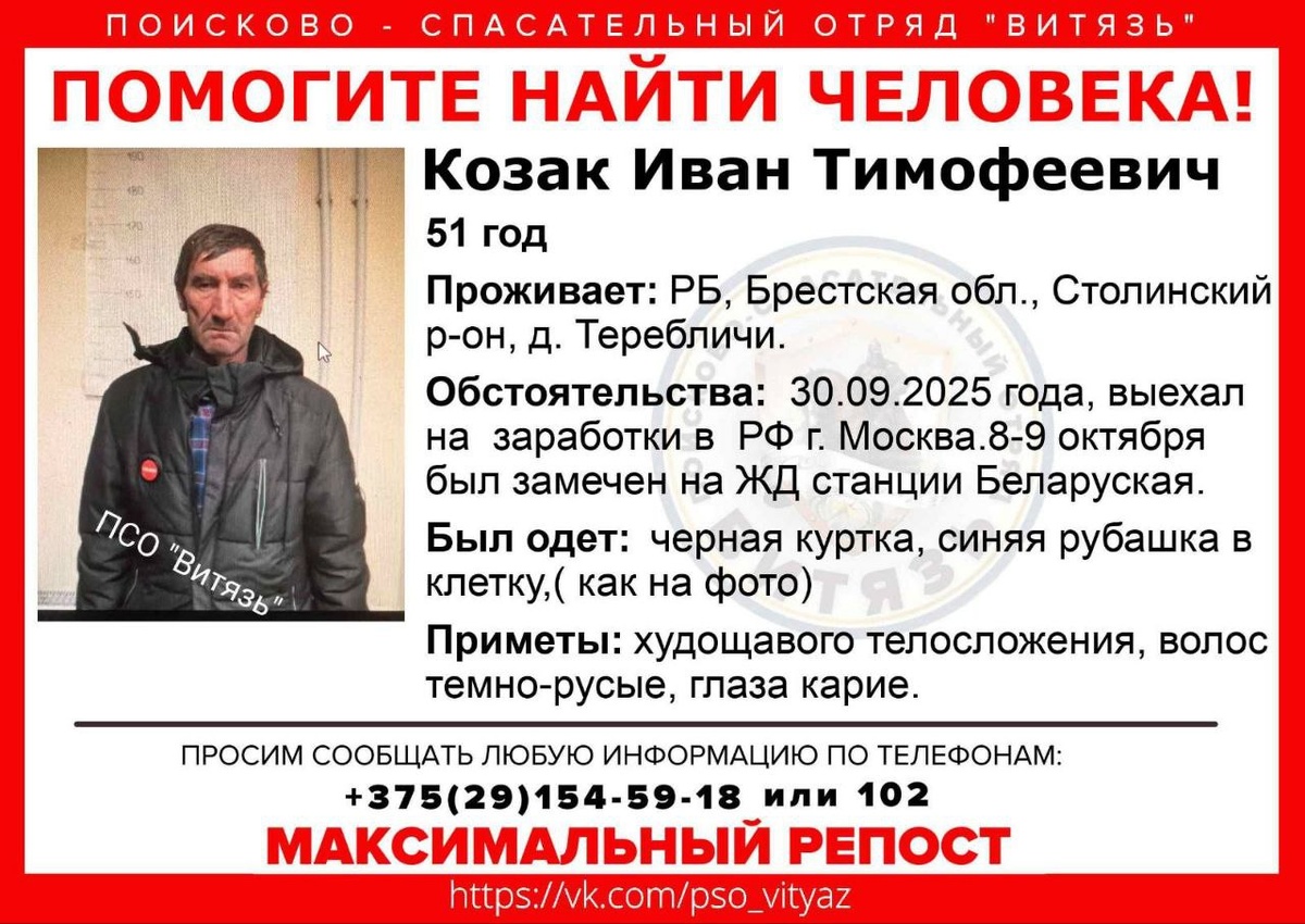 Внимание! Помогите найти человека! Пропал #Козак Иван Тимофеевич, 51 год. Проживает: РБ, Брестская обл., Столинский р-он, д. Теребличи. 30.09.2025 года, выехал на заработки в РФ г. Москва. 8-9 октября был замечен на ЖД станции Беларуская. Одежда: черная куртка, синяя рубашка в клетку,( как на фото) Приметы: худощавого телосложения, волос темно-русые, глаза карие. Всех, кто владеет информацией, просим сообщить: ПСО "ВИТЯЗЬ" +375(29)154-59-18 #ПСО_Витязь