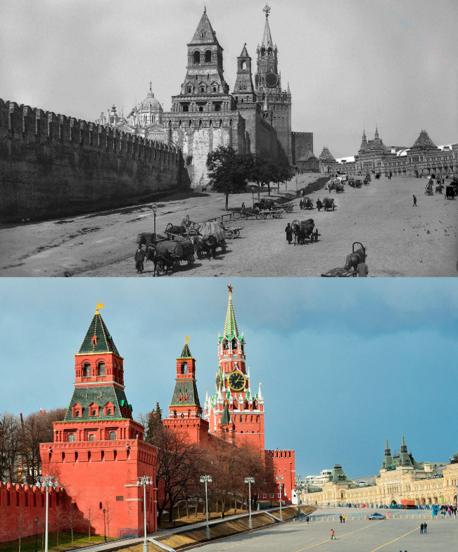 Площадь выглядела совсем иначе. Не было Мавзолея (его построили в 1924 году). По брусчатке свободно ездили извозчики — площадь не была пешеходной! А вдоль стен Кремля тянулись торговые ряды.