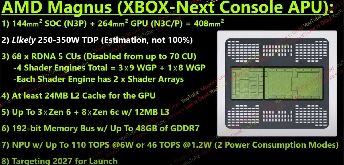 Магнус не предавал! Moore’s Law is Dead поделился новыми подробностями о APU Magnus от AMD для Xbox следующего поколения. Основное изменение — шина памяти: вместо ранее заявленных 384 бит теперь 192-битная с поддержкой до 48 ГБ DDR7. Также уточнён TDP — 250–350 Вт и количество активных вычислительных блоков RDNA 5 — будет доступно 68 из 70. Также чип включает NPU с максимальной мощностью до 110 TOPS. Выход Xbox с Magnus ожидается в 2027 году.