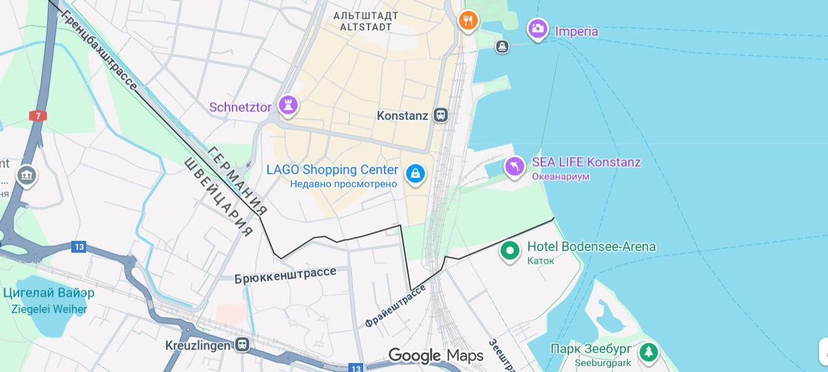 Я побывал в интересном месте - двойном городе Констанц-Кройцлинген. Если взглянуть на снимок с дрона или на карту, то может создаться впечатление, что это вообще один город. Но нет - хотя плотная городская застройка с обеих сторон подходит к линии границы, и эта граница идет фактически прямо по улицам, жители Констанца и Кройцлингена проживают в разных государствах, причем одно из них - это ЕС, НАТО и еврозона, а второе - внеблоковое государство со своей валютой.