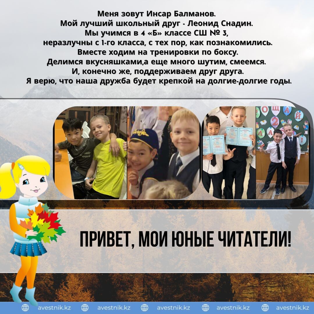 📖 Хотите, расскажу осеннюю сказку? Жил на высоком дереве листочек. Он был зеленым, впитывал в себя лучи солнышка, наполнялся водой. Но вот наступили холода. Пришлось нашему красавцу сменить зеленый наряд на желто-оранжевый. Однажды подул холодный ветер, безжалостно сорвал листочек и бросил под ноги людей. На счастье, рядом проходил школьник. Такой же, как вы. Увидел листик и поднял его с земли: «Ты будешь украшением моей поделки», — прошептал он. Так кленовый листочек получил новую жизнь – стал деталью осеннего пейзажа. 🍂 Ребята, расскажите, чем вам нравится осень? И не забывайте про конкурс – «Мой лучший школьный друг». Жду ваши письма на почту: avestnik@mail.ru и в директ Instagram-аккаунта @vestnikaktobe. 👫 «Мой лучший школьный друг» Меня зовут Инсар Балманов. Мой лучший школьный друг — Леонид Снадин. Мы учимся в 4 «Б» классе СШ №3, неразлучны с 1-го класса, с тех пор, как познакомились. Вместе ходим на тренировки по боксу. Делимся вкусняшками, а еще много шутим, смеемся. И,