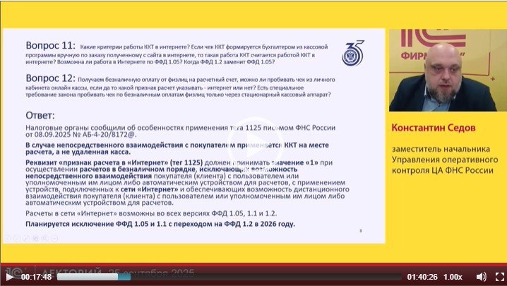 ‼️ Про критерии работы в интернете рассказал Константин Седов, заместитель начальника Управления оперативного контроля ЦА ФНС, России в лекции на тему Новый формат фискальных данных: практика применения, рекомендации по практическим кейсам, поддержка в 1С Отзыв слушателя: Спасибо за лекцию, очень объемно, познавательно. 👉 Смотрите бесплатно полную видеозапись лекции 🚨Подписывайтесь на @lector_1c